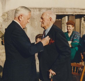 Georges MARTIN recevant la croix de l'Ordre National du Mérite de M. Jean-Louis FOREST, le 11 novembre 1989, à Saint-Etienne-de-Chigny (37) (photo coll. J.-J. Martin, D.R)